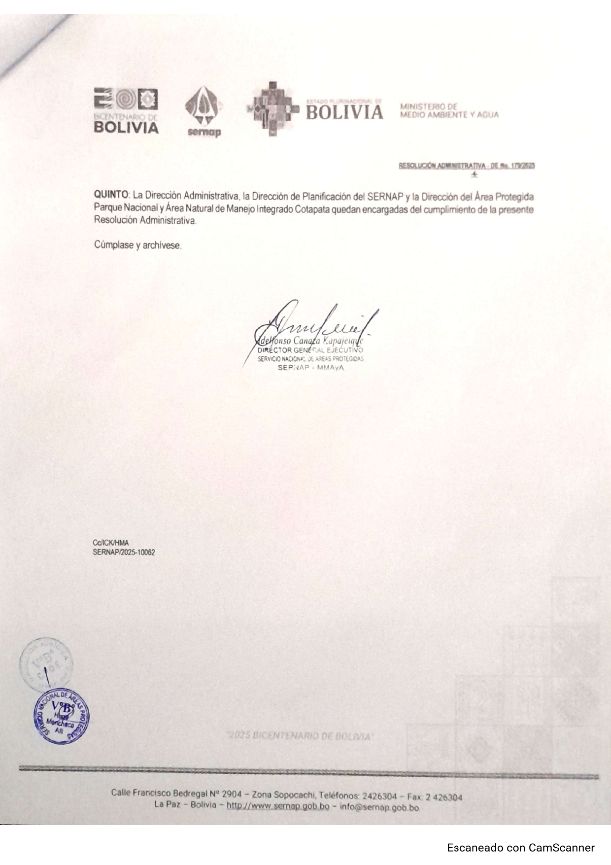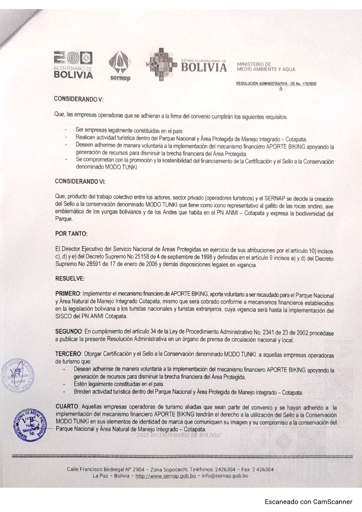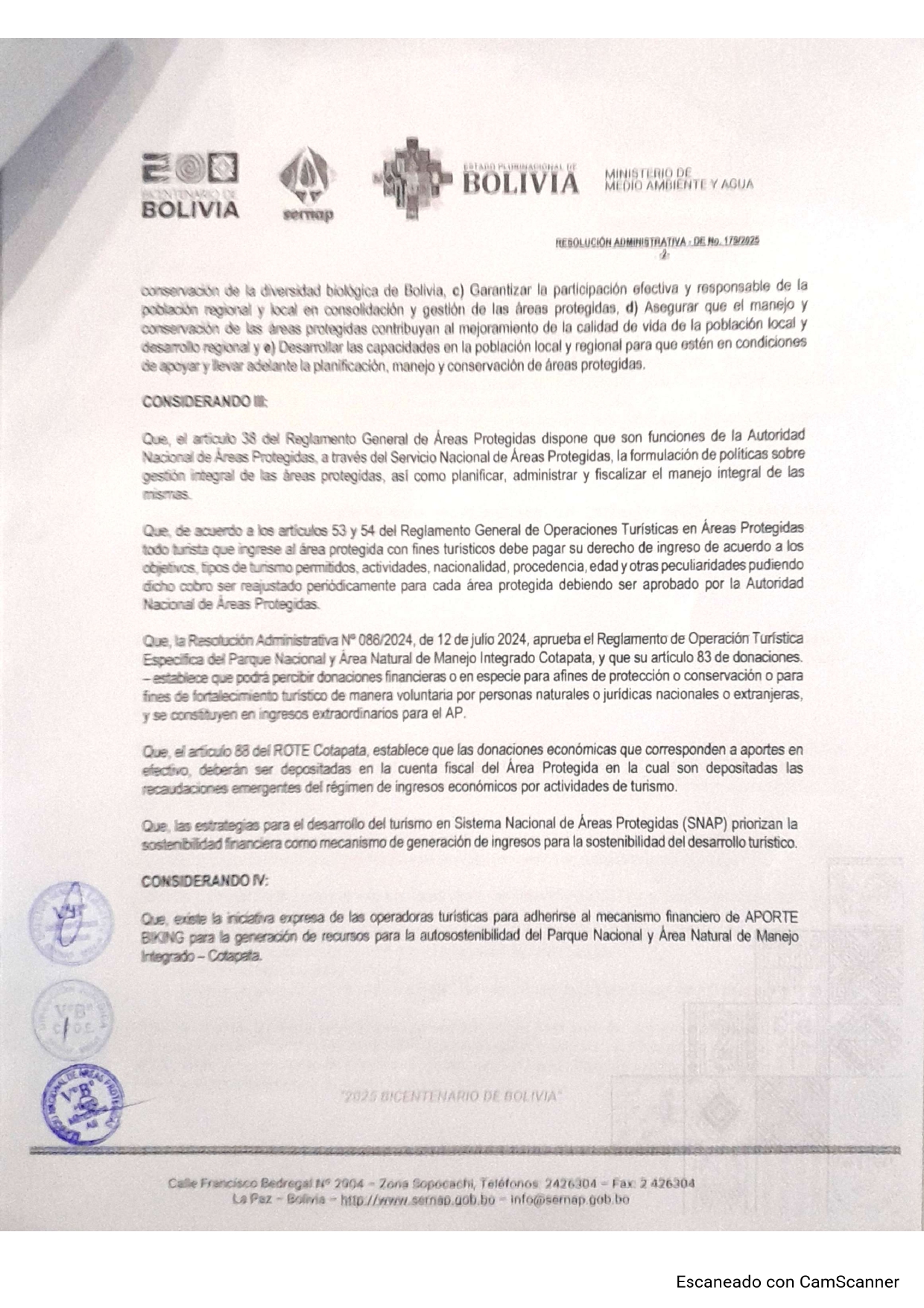 En el marco de la Resolución Administrativa DE No. 179/2025 y en cumplimiento al art. 34 de la Ley de Procedimiento Administrativo Nº 2341 de 2002: el Servicio Nacional de Áreas Protegidas (SERNAP) informa que se da inicio a la implementación del mecanismo financiero voluntario denominado APORTE BIKING para el Parque Nacional y Área Natural de Manejo Integrado Cotapata. Este aporte será recaudado de turistas nacionales y extranjeros según la normativa boliviana vigente, y estará vigente hasta la puesta en marcha del SISCO del Área Protegida Nacional.