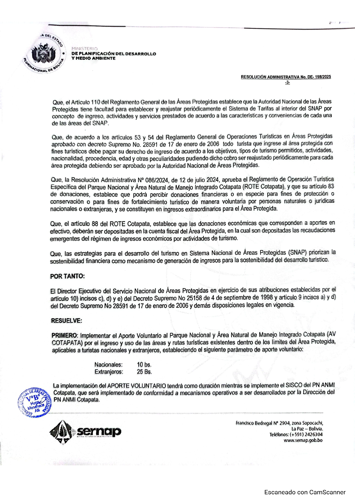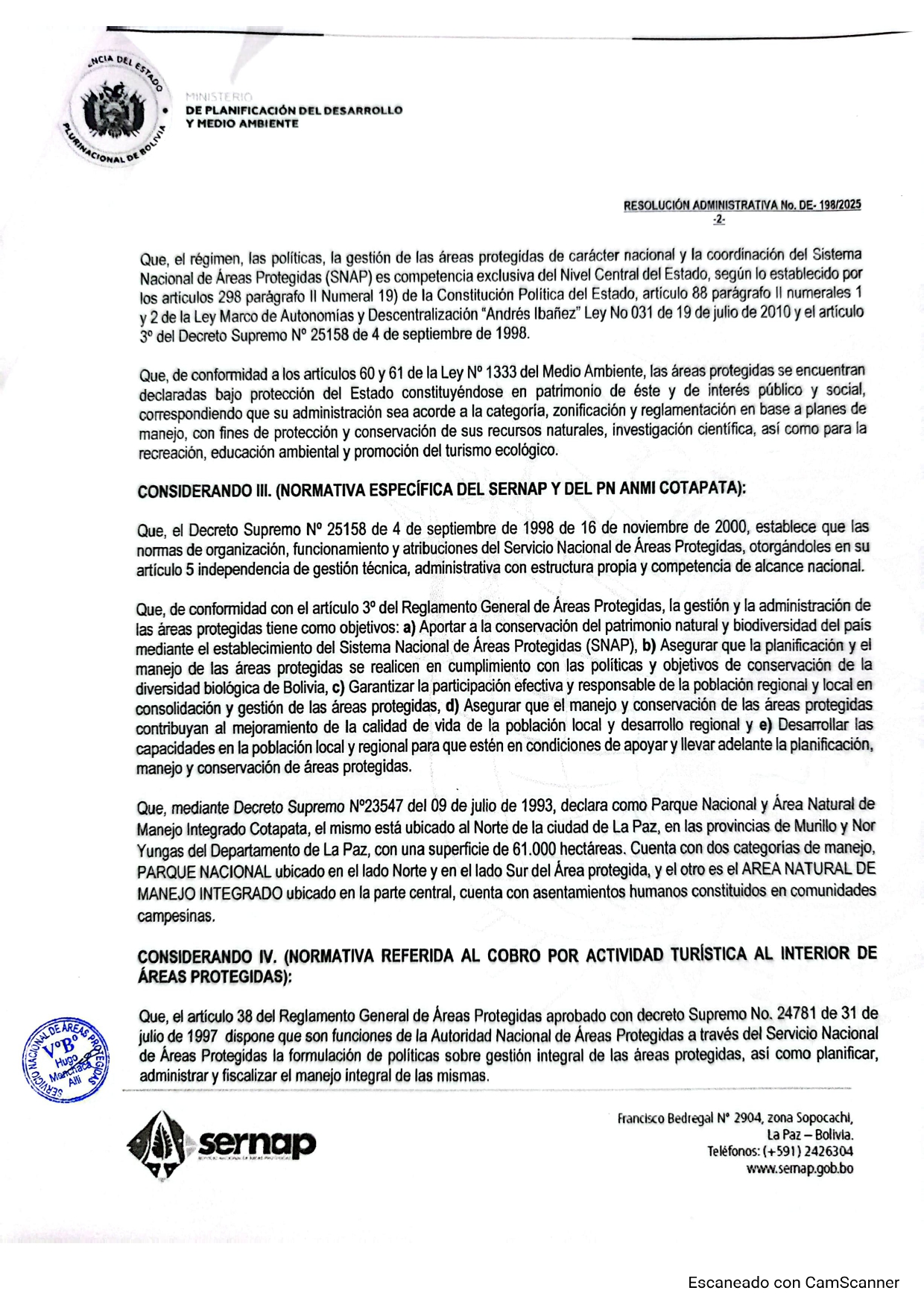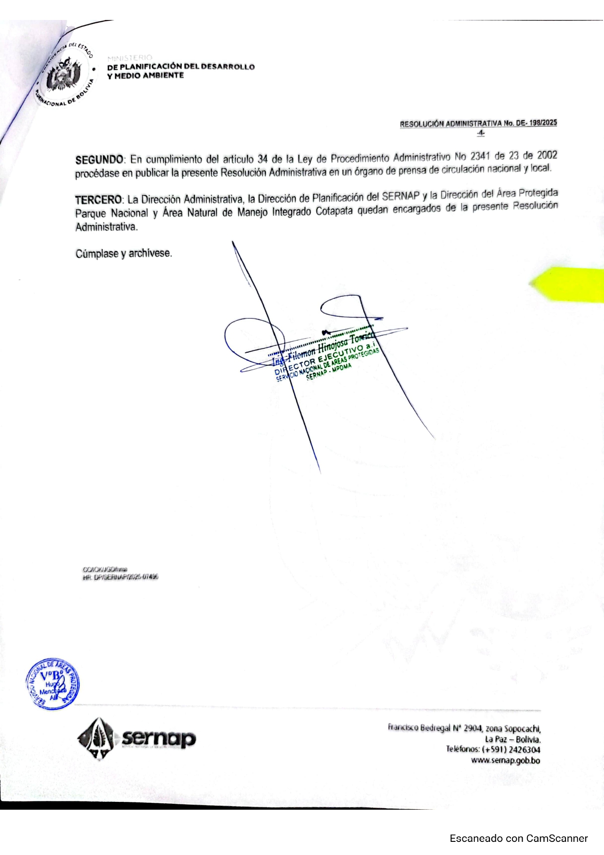 El Servicio Nacional de Áreas Protegidas - SERNAP, comparte la Resolución administrativa Nº DE 0198/2025, en cumplimiento al punto segundo de la misma, para conocimiento público.